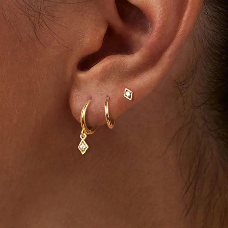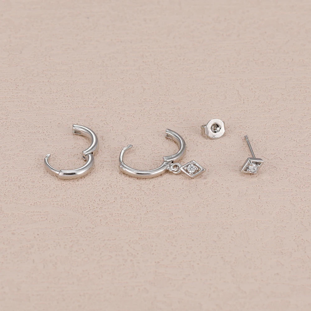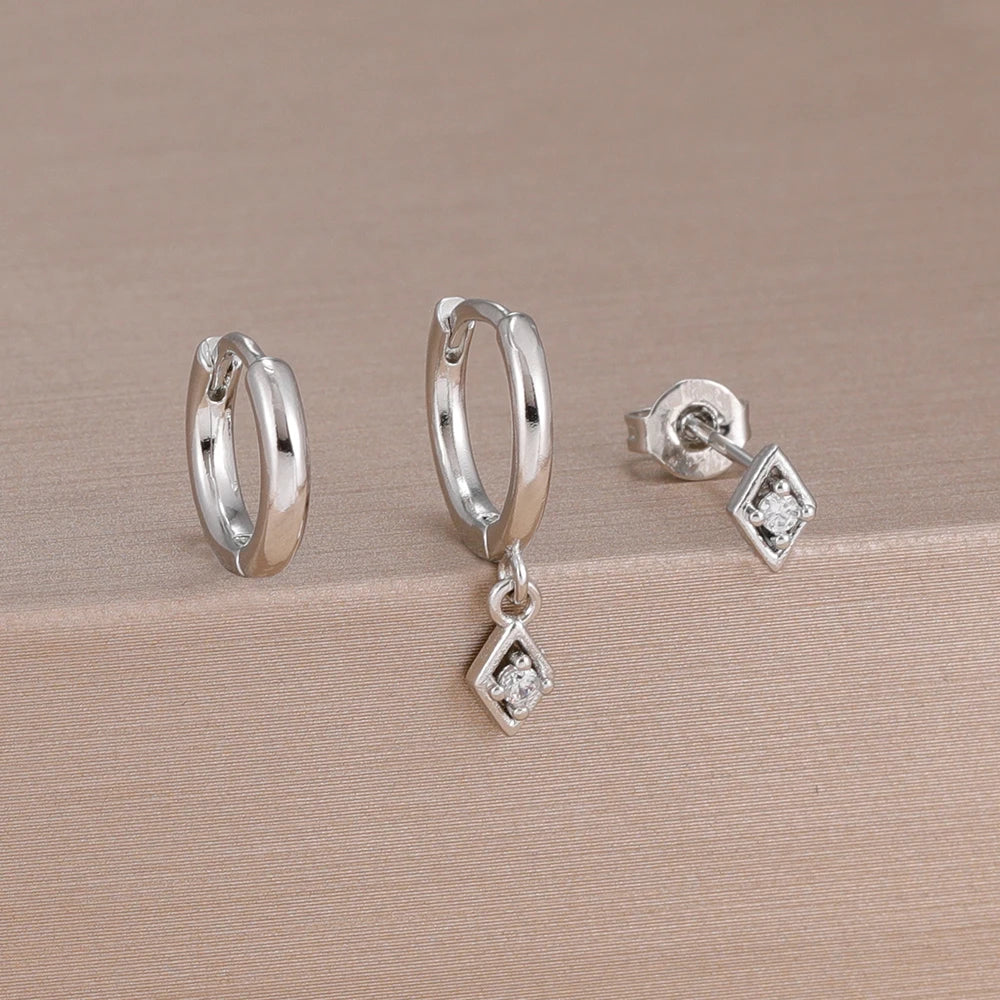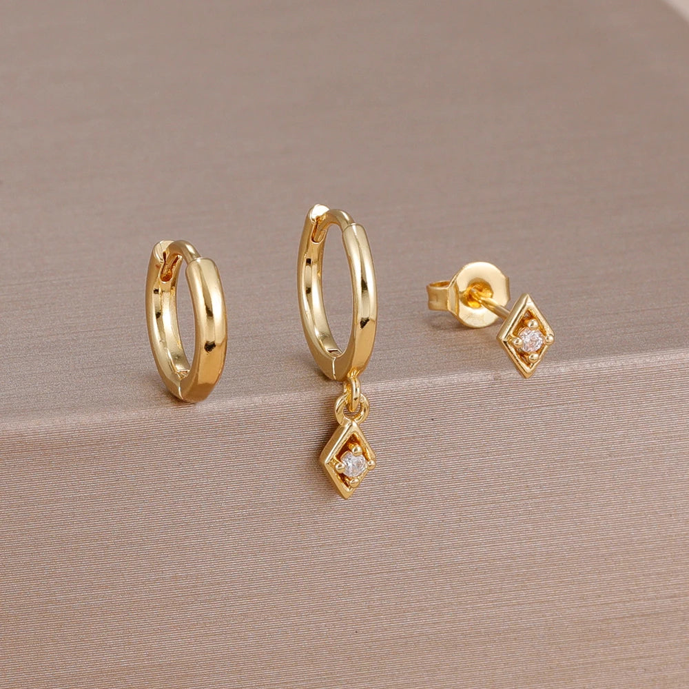 The Riven Zircon Set blends punk-inspired design with timeless elegance, featuring three gold-plated huggie earrings adorned with geometric zircon charms. A perfect mix of edge and sophistication.