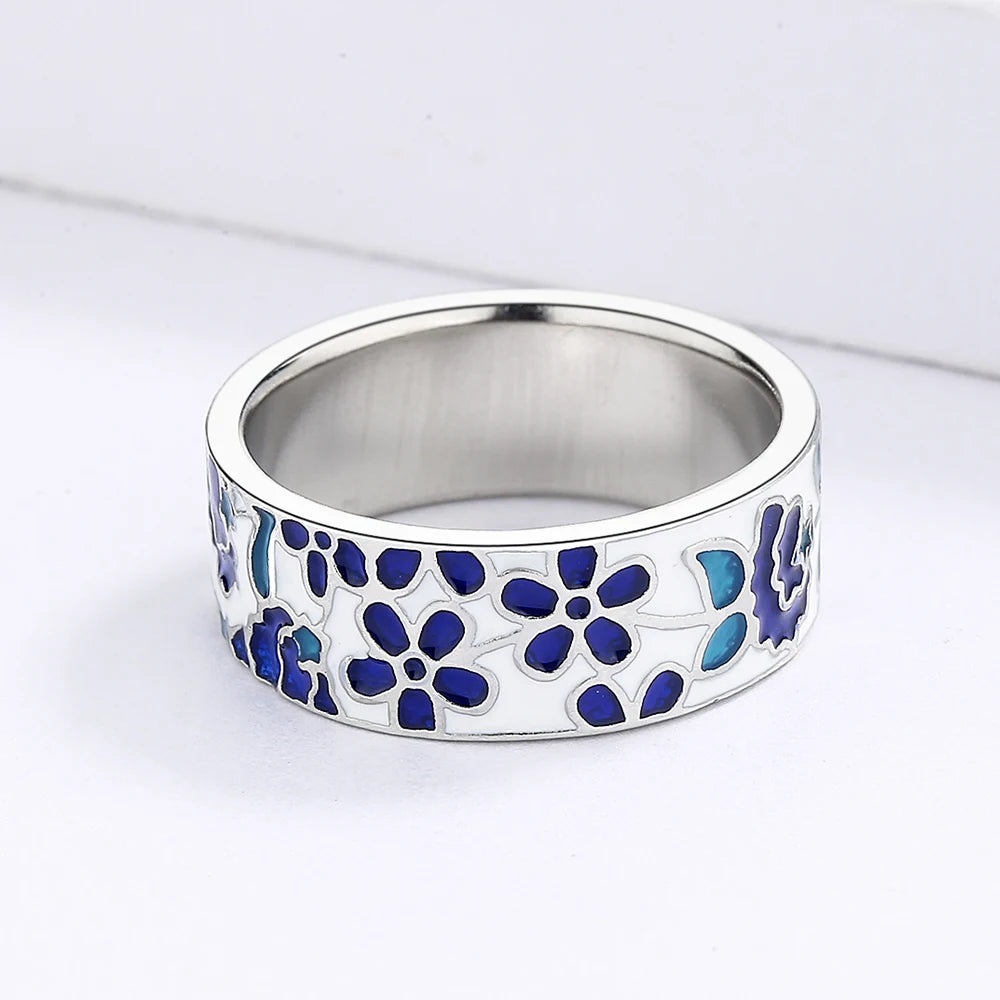 A striking fusion of artistry and elegance, this handcrafted enamel ring features intricate blue floral patterns that add a refined pop of color to any outfit.