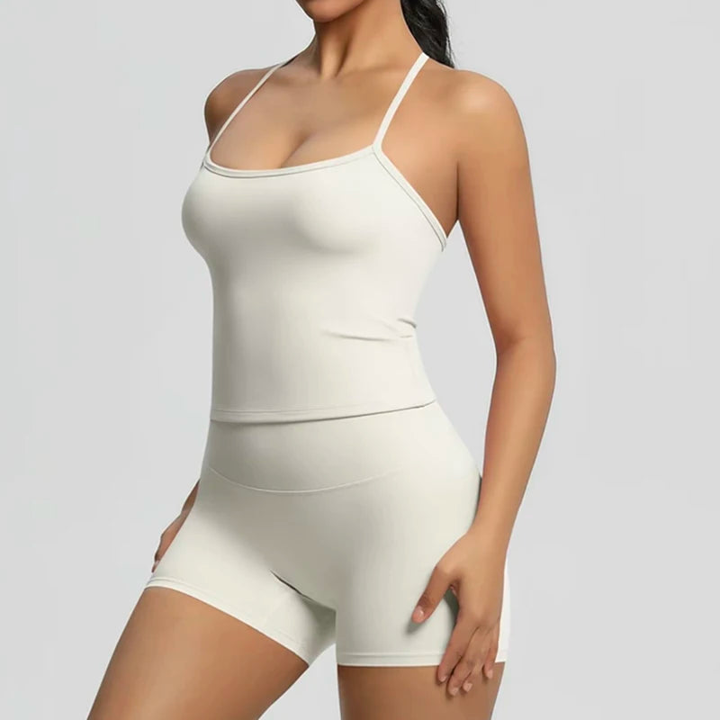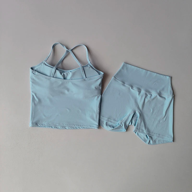 Designed for performance and style, this sleek yoga set features a slim-strap crop top and high-waisted shorts for a sculpted, second-skin fit.