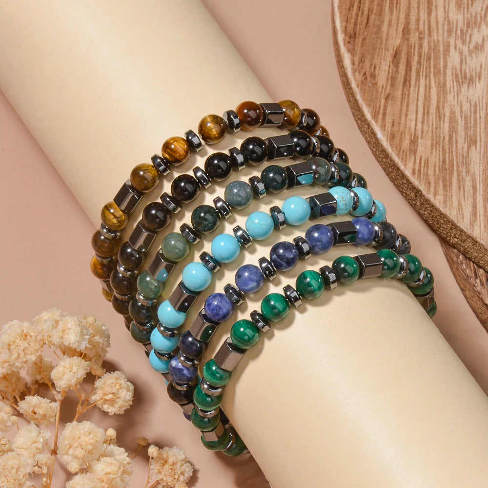 The Arlen Bracelet blends natural strength and style through a mix of tiger eye, moss agate, and hematite stones. Designed for balance and confidence, it’s a refined accessory for everyday wear.