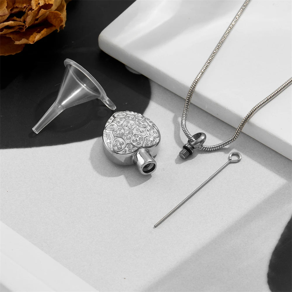 This cremation necklace is designed to hold ashes in a sleek stainless steel pendant, offering a meaningful way to keep loved ones close. The addition of rhinestones adds a touch of elegance, making it both a sentimental and stylish memorial piece.