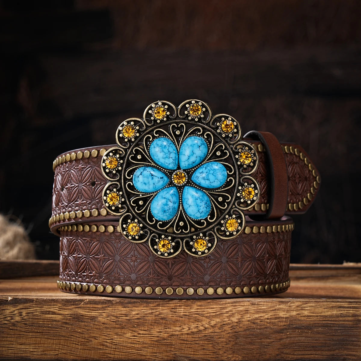 Bold and distinctive, this Western-style belt features intricate floral engraving and a turquoise gemstone buckle—perfect for adding cowboy charm to any outfit.