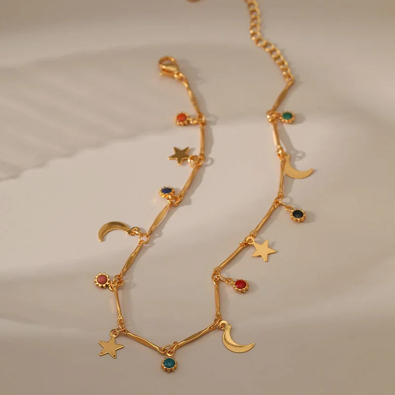 This handmade retro anklet features sweet star and moon charms, crafted with vibrant enamel details. Made from durable zinc alloy, this adjustable anklet adds a whimsical, celestial touch to any outfit, perfect for casual wear or as a fun accessory for special occasions.