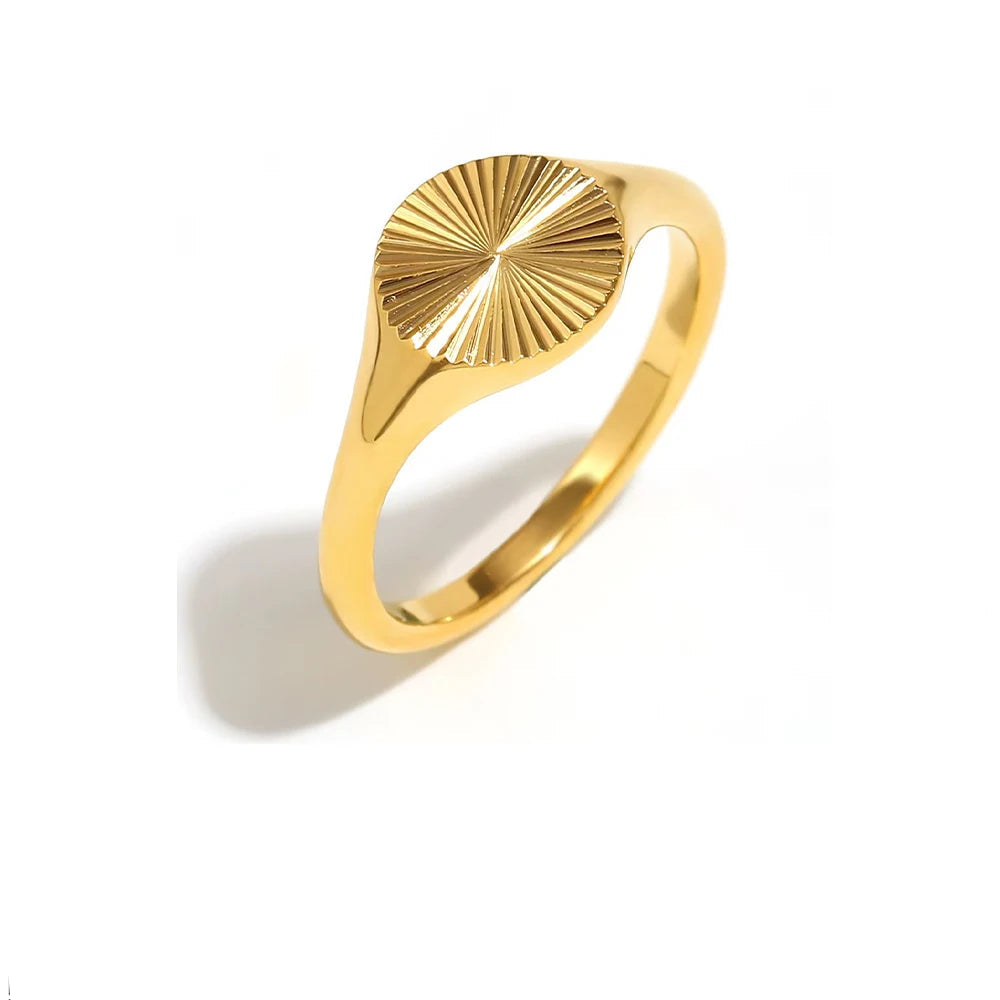 Crafted from durable stainless steel and plated in 18k gold, this minimalist yet bold ring features a textured wave design that creates a captivating geometric pattern. The sleek, chunky dome style makes it a perfect accessory for any occasion, offering both elegance and edginess in one stunning piece.