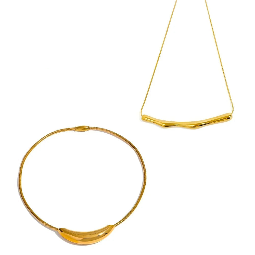 The Orion Curved Necklace blends minimalist design with a futuristic edge. Its smooth, curved tube shape and sleek snake bone chain offer a bold yet refined statement, perfect for modern, chic styling.