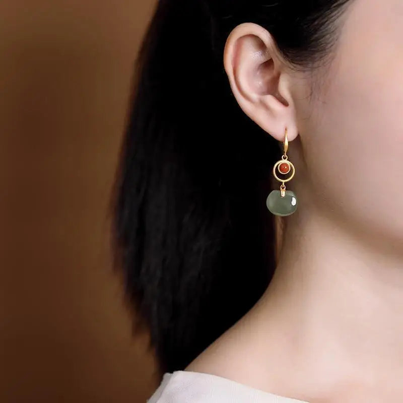 The Tourmaline Blossom Drops feature natural Hotan jade in a vibrant green round shape, beautifully complemented by South Red Tourmaline accents. These long, classic drop earrings are designed for those who appreciate timeless elegance, making them perfect for any formal occasion or as a special gift.