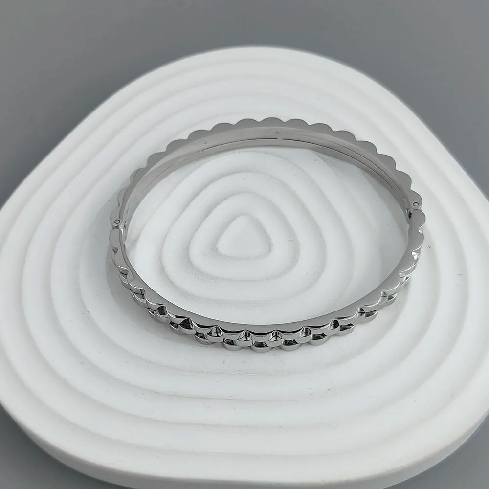 This elegant gear-shaped bangle bracelet is crafted from high-quality stainless steel and plated with 18K gold for a luxurious finish. Waterproof and designed for durability, it’s the perfect gift for a wife or as a stylish accessory for any occasion.