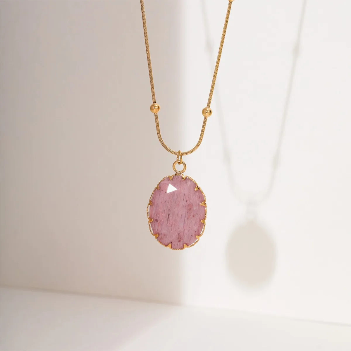 This elegant pendant necklace features a pink natural stone set in a stainless steel oval frame, complemented by a celestial-inspired black onyx charm. The 18K gold plating ensures long-lasting durability and tarnish-free wear, making it the perfect accessory for parties or as a standout piece in your jewelry collection.