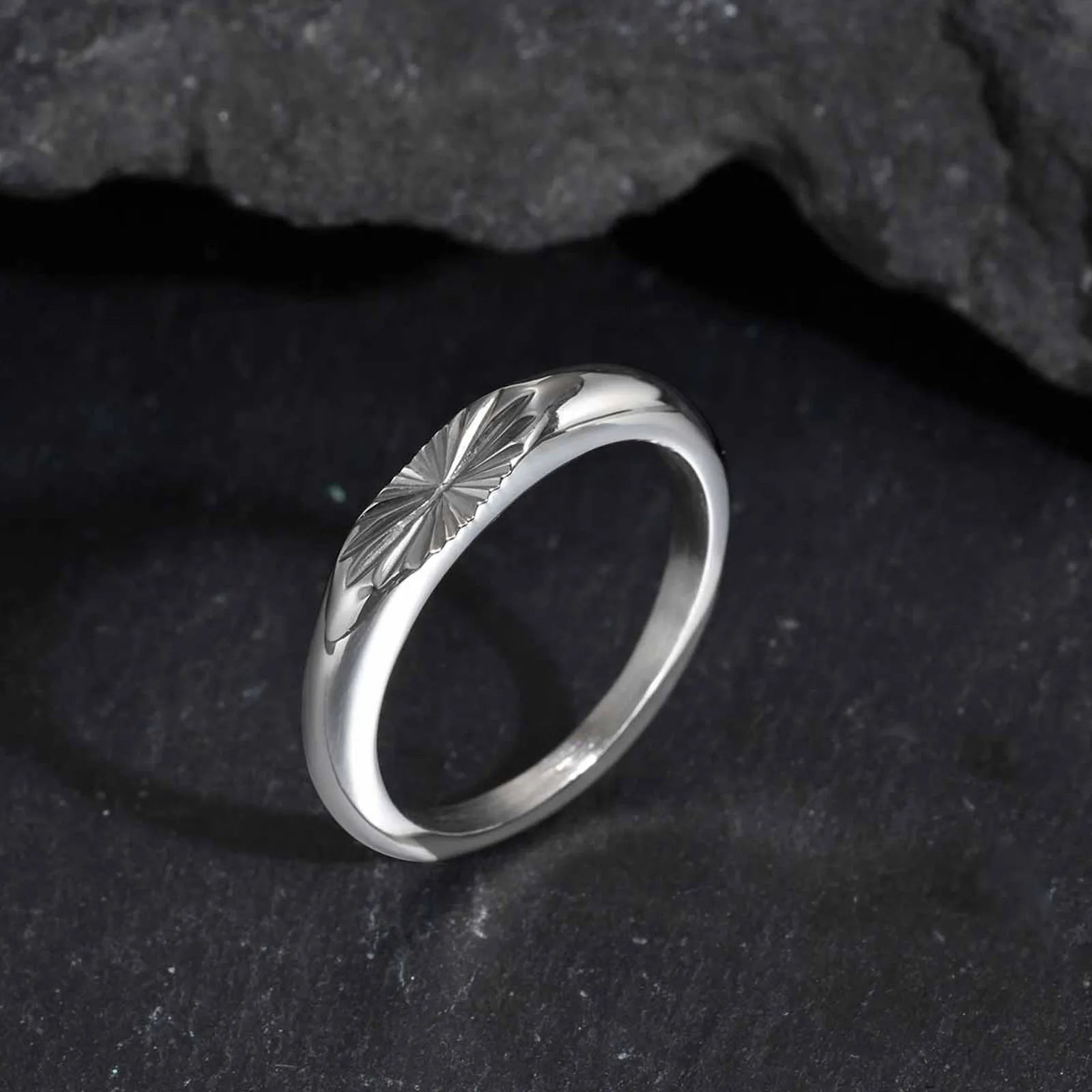 Elegant and understated, this minimalist stainless steel ring features a radiant sunburst engraving—symbolizing strength, energy, and timeless style.