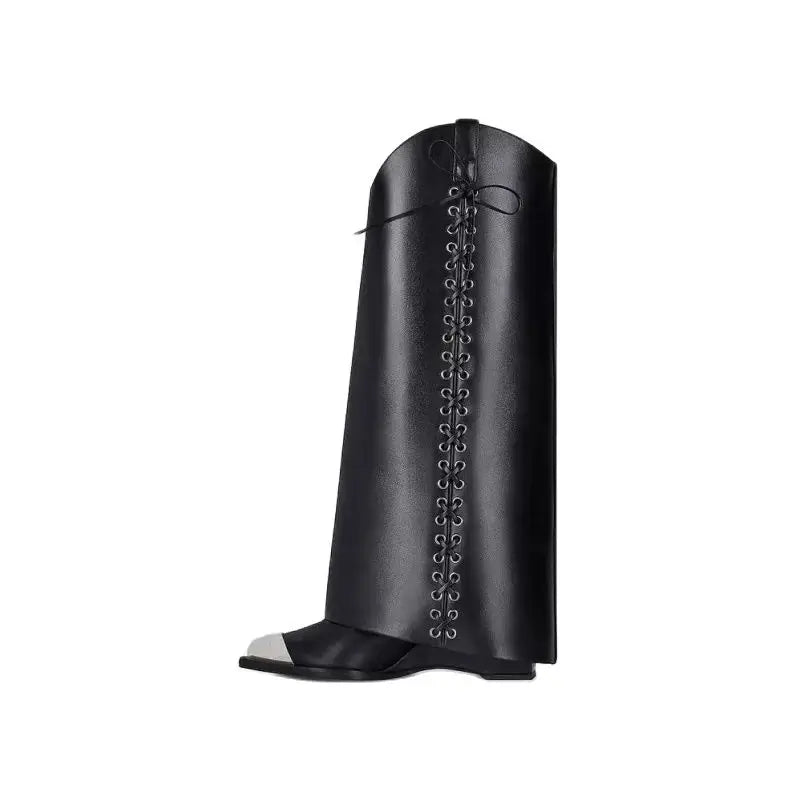Bold and glamorous, these knee-high boots feature metallic pointed toes, rivet details, and cross-lacing for a striking statement look. The sleek wedge heel adds height and confidence—perfect for evening events or fashion-forward outings.