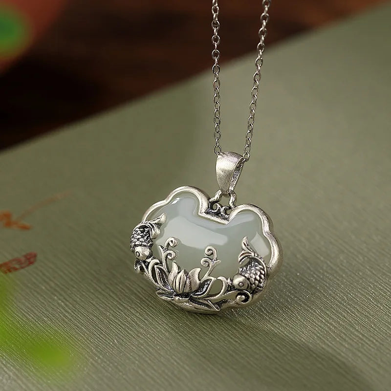 The Fish Pendant Necklace features natural Hotan jade in a unique fish-shaped lotus flower design, combining the elegance of Chinese style with a modern twist. Set in 925 silver with a box chain, this necklace symbolizes harmony and prosperity, making it an ideal accessory for weddings or special occasions.
