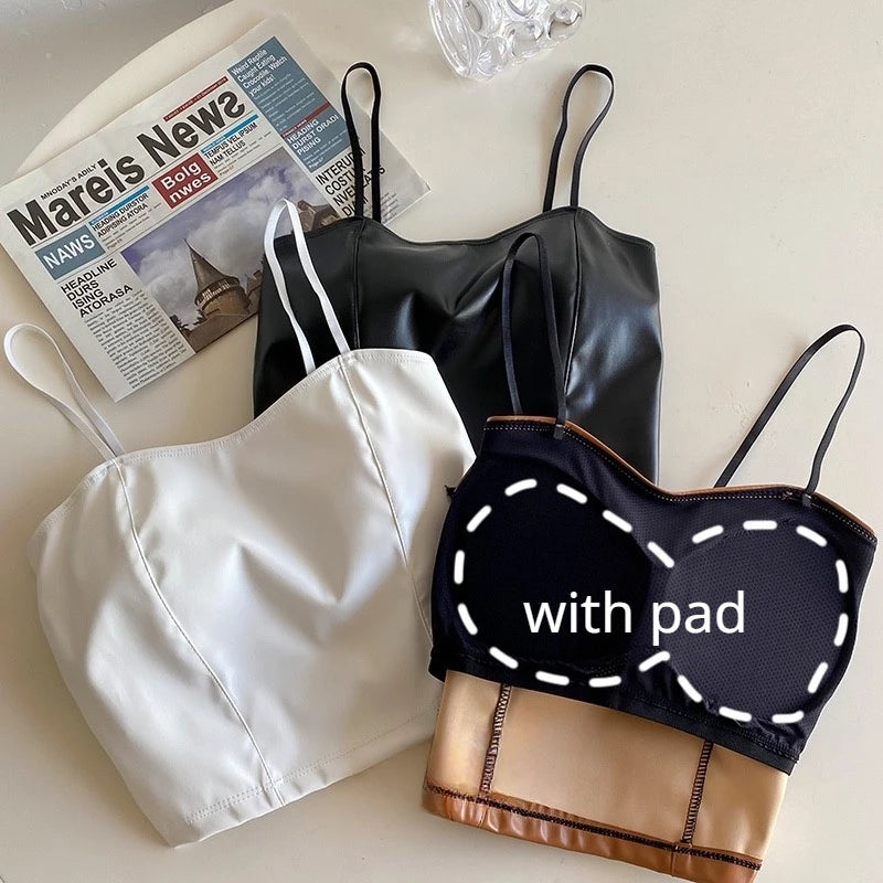 Bold and alluring, the Rhea Crop Top combines sleek PU leather with a flattering halter silhouette. Designed with built-in bra padding and delicate spaghetti straps, it’s the perfect statement piece for nights out or trendy streetwear looks.