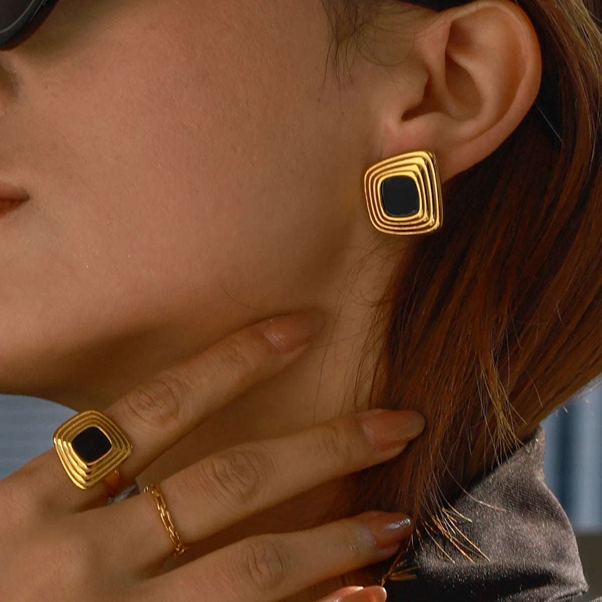 The Marlow Shell Earrings embody refined elegance with a touch of vintage charm. Their geometric ribbed design and black shell center create a striking balance of texture and shine.