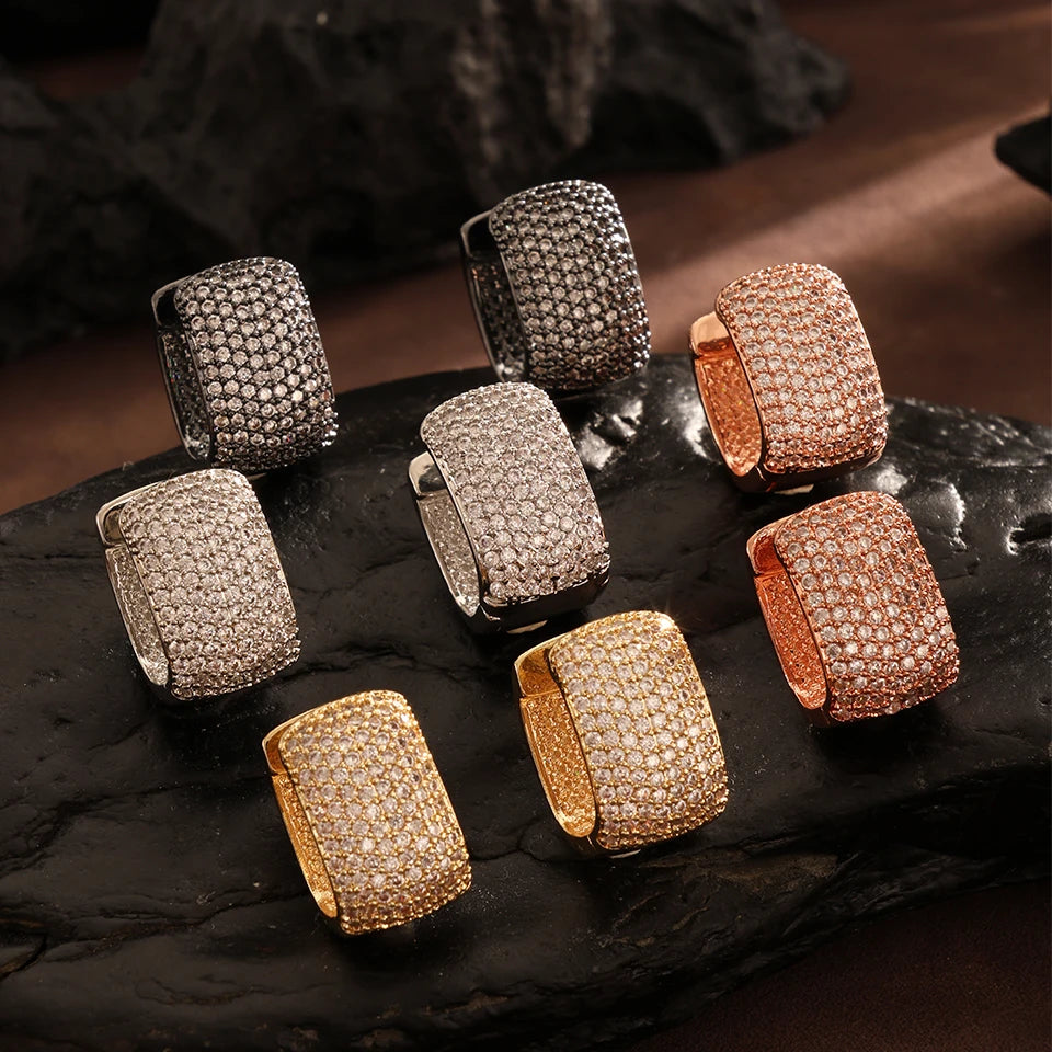 These luxurious hoop earrings are encrusted with full cubic zirconia, offering a blinged-out, glamorous look. Made from copper and designed with a geometric shape, they are the perfect accessory for brides or anyone seeking a high-end, sophisticated touch to their outfit.
